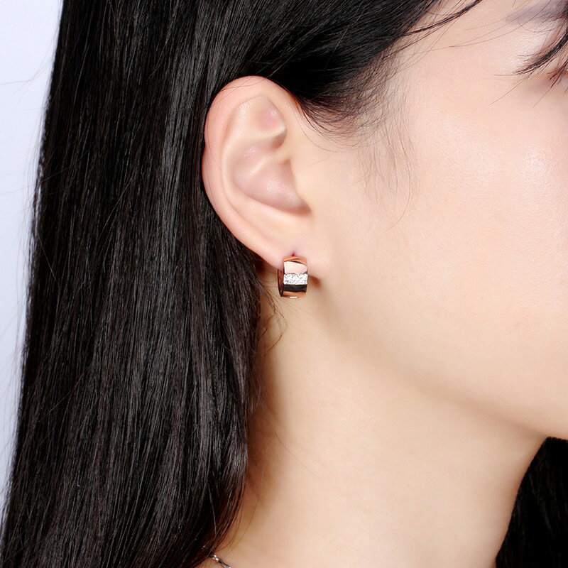 結婚式やパーティーに使えるステンレスピアスをコンセプトに作られたピンクゴールド色のワイドな甲丸リングピアスの真中にキラキラのクリスタルを並べたスタイリッシュなフープピアス。