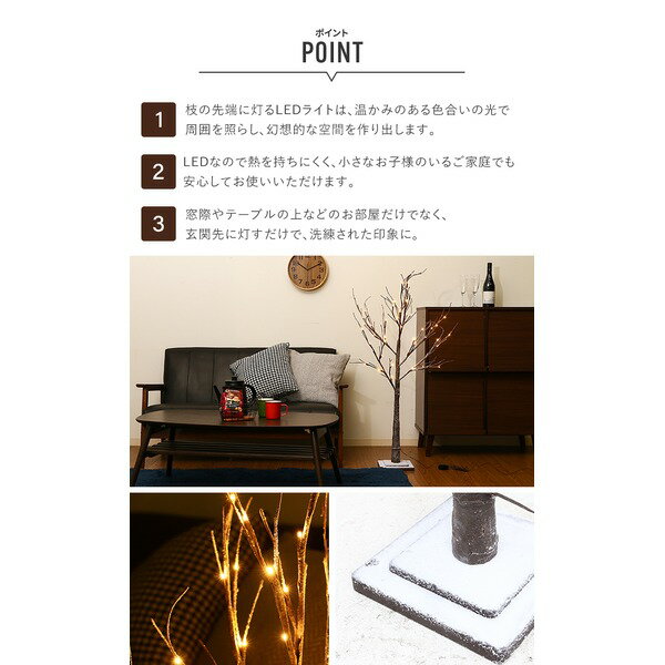 枝の先端に灯るLEDライトは、温かみのある色合いの光で周囲を照らし、幻想的な空間を作り出します。