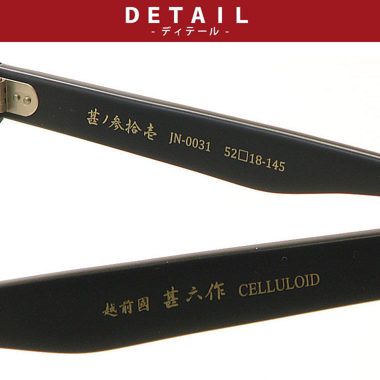 品 名 越前國 甚六作 JN-0031-C3 カラー マットブラック/ブラック 材 質 セルロイド、合金 原産国 日本 サイズ レンズ横幅:52mmレンズ縦幅:34.5mmブリッジ幅:18mmテンプル長さ:145mmフレームの横幅:140mm 付属品 甚六作オリジナルケース