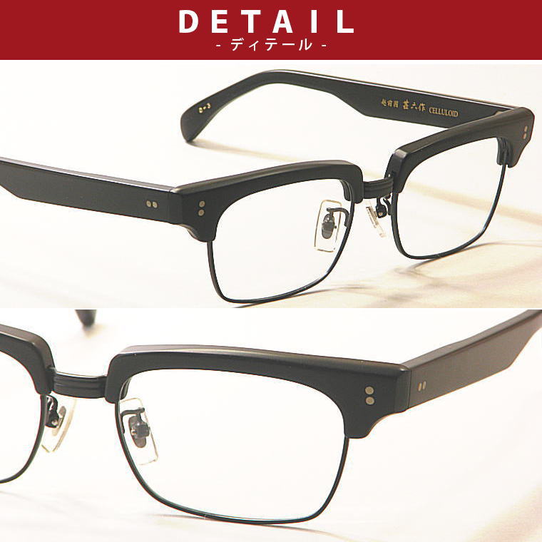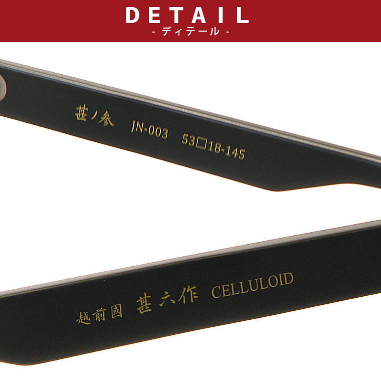 品 名 越前國 甚六作 JN-003-C3 カラー マットブラック/ブラック 材 質 セルロイド、合金 原産国 日本 サイズ レンズ横幅:53mmレンズ縦幅:35mmブリッジ幅:18mmテンプル長さ:145mmフレームの横幅:141mm 付属品 甚六作オリジナルケース