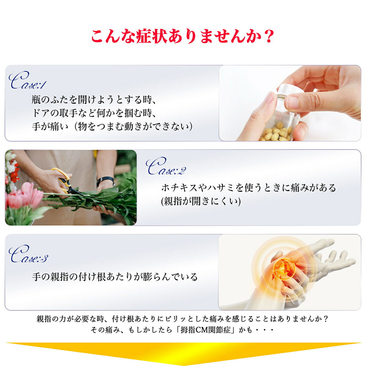 親指の痛み・ばね指・母指CM関節症・腱鞘炎・ドゲルバン病等の痛みやお悩みの方におすすめしております。